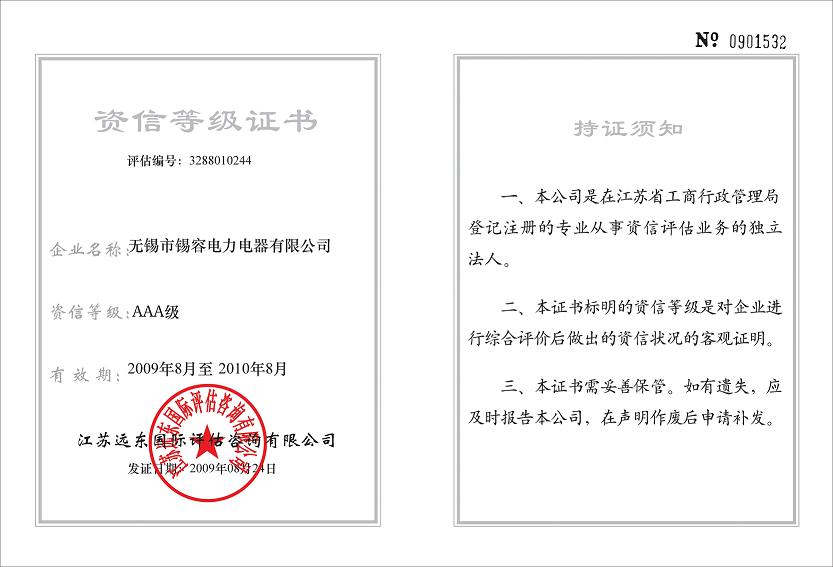 Credit rating certificate release time:2020-07-20 04:33:09source:Wuxi Xirong Electric Appliance Co., Ltd.Click:1687